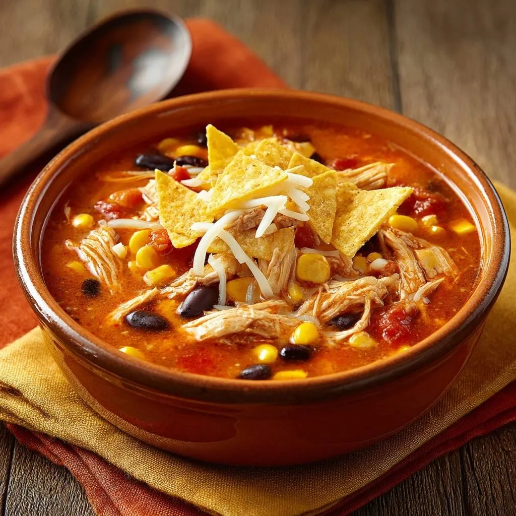 - Ladle hot soup into bowls. Top with crushed tortilla chips, shredded cheese, and sliced green onions right before serving for maximum crunch. Enjoy immediately!