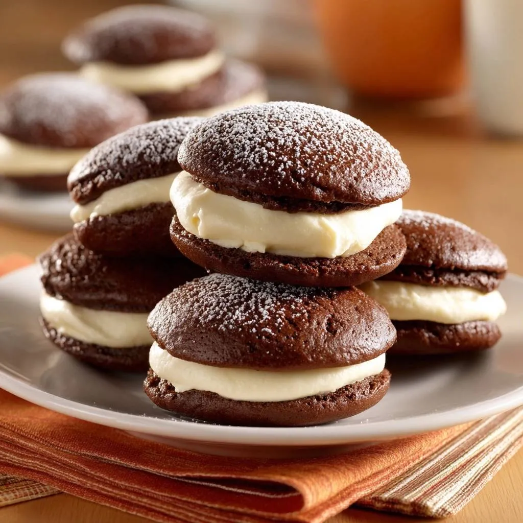 Spread or pipe onto flat sides of half the cooled pies. Top with others gently. Dust with powdered sugar for that bakery finish on chocolate whoopie pies.