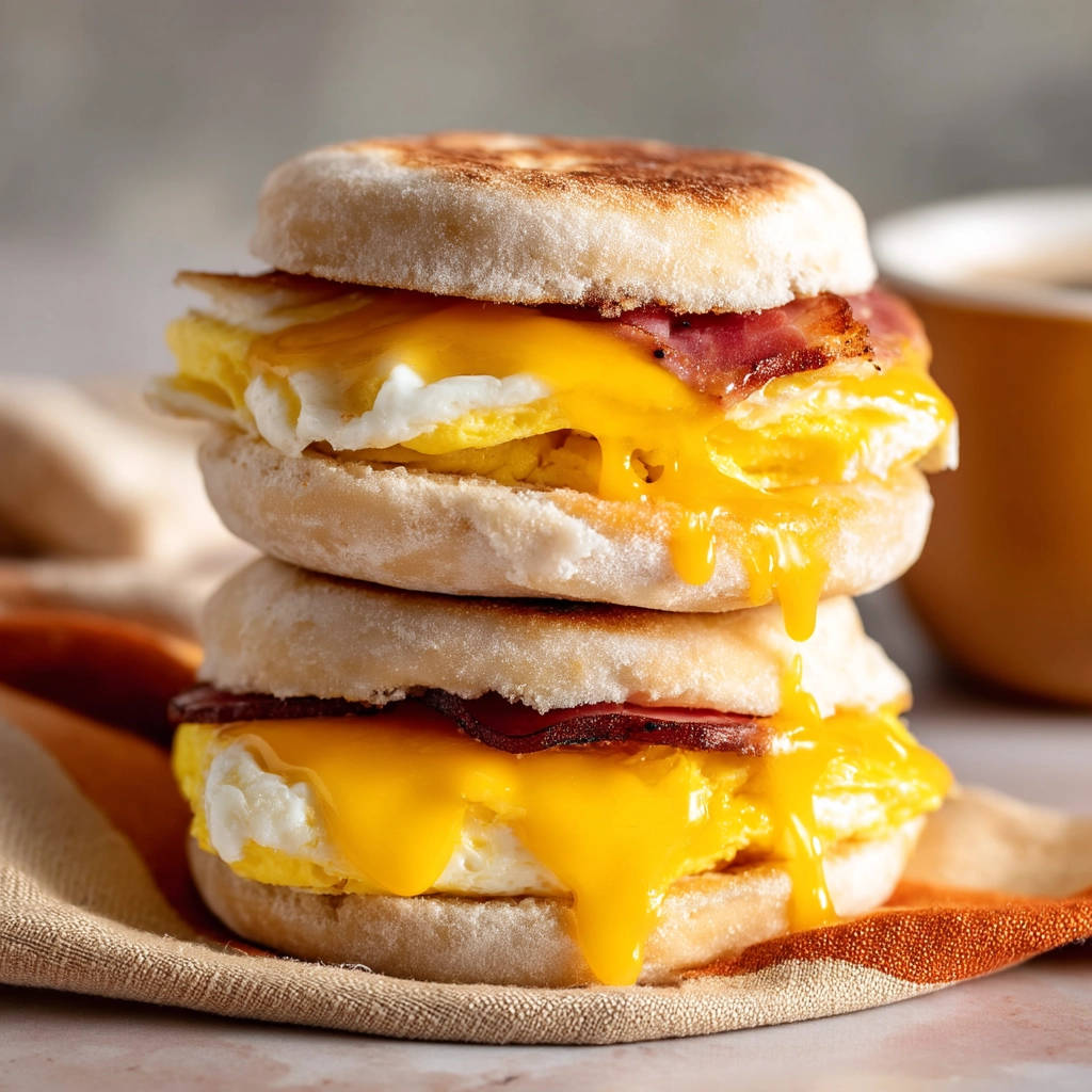 - Assemble Your Masterpiece: Now it’s time to assemble your classic breakfast sandwich! Place the cheesy egg on the bottom half of a toasted English muffin. Top with two slices of crispy bacon. Place the top half of the muffin on top. Repeat for the second sandwich.