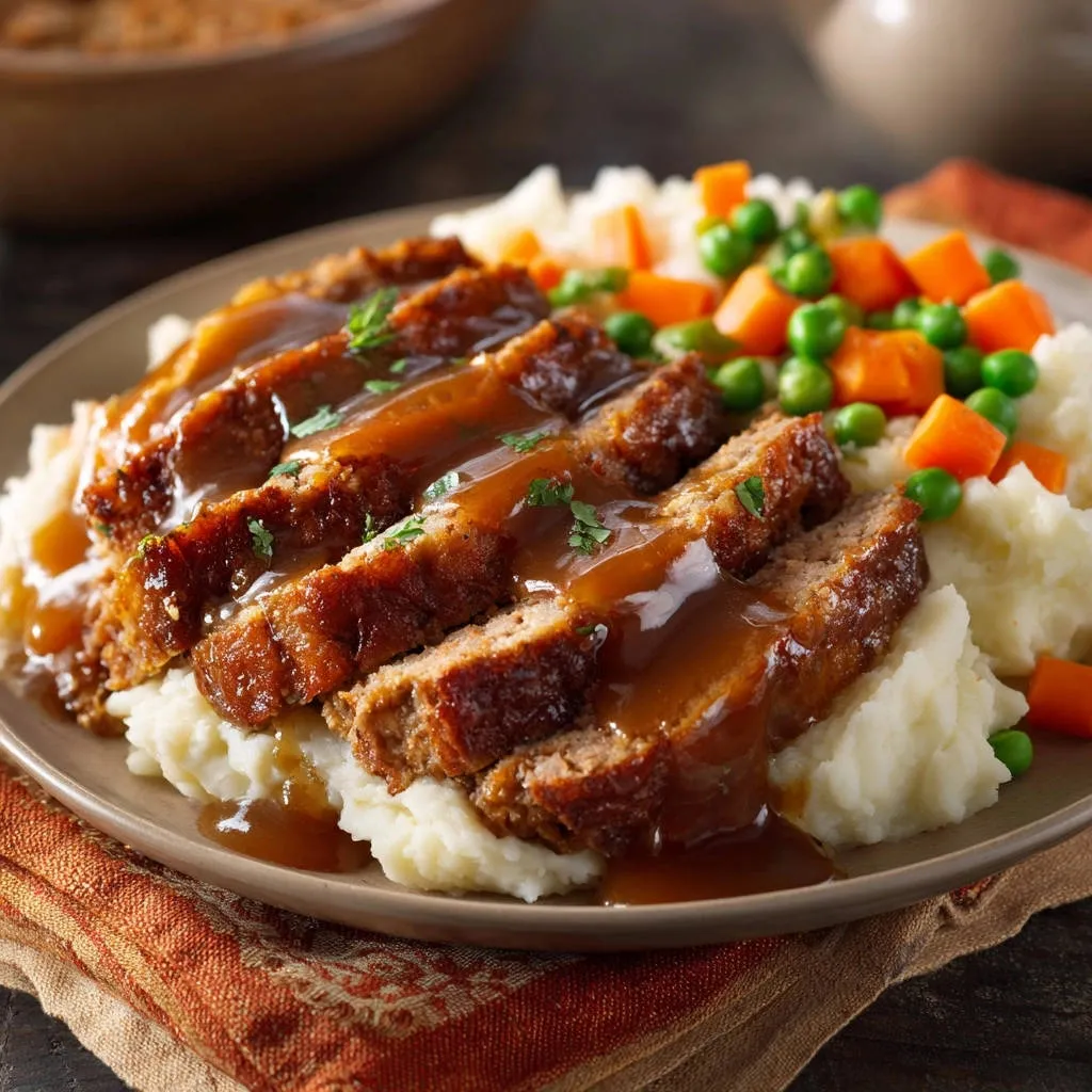 - Slice the meatloaf and serve hot with mashed potatoes, peas, carrots, and plenty of gravy poured over top.