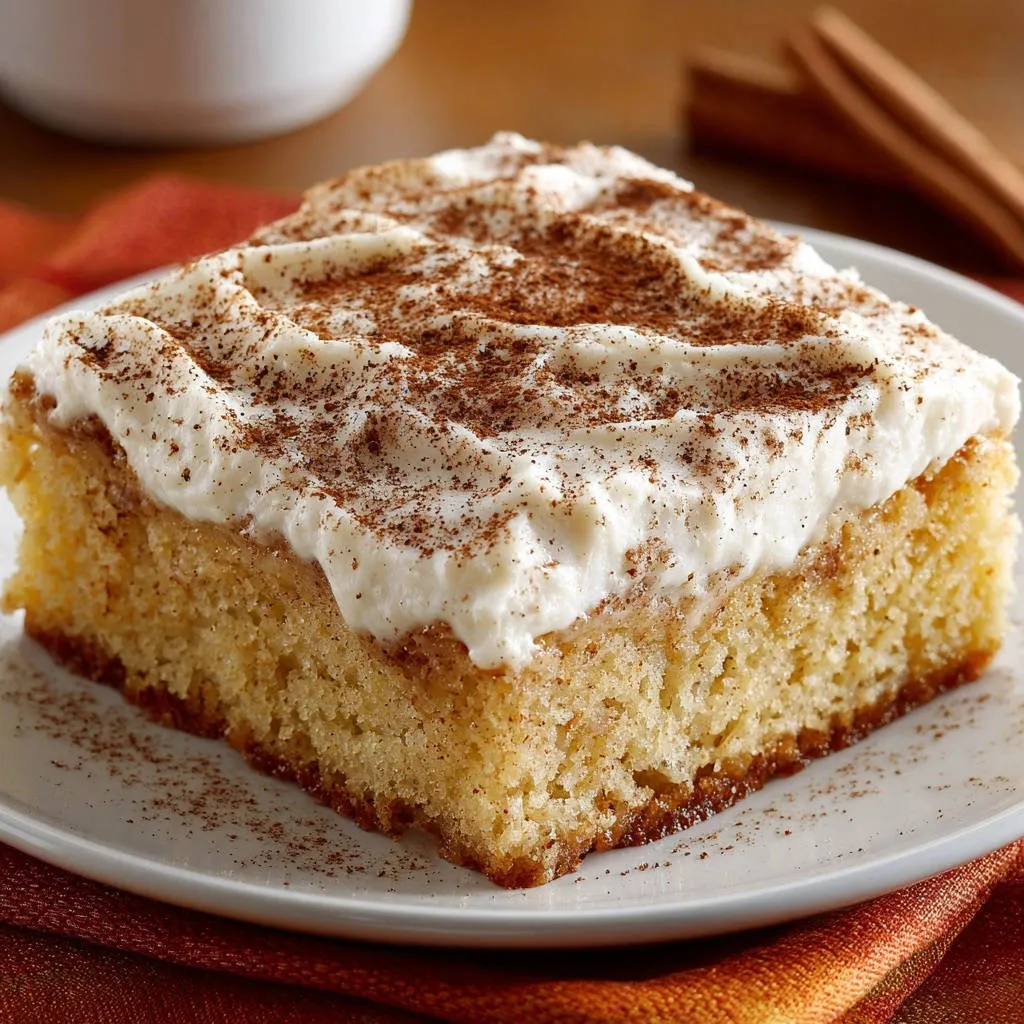 - Spread the cream cheese frosting evenly over the cooled cake. Lightly dust with ground cinnamon before serving.