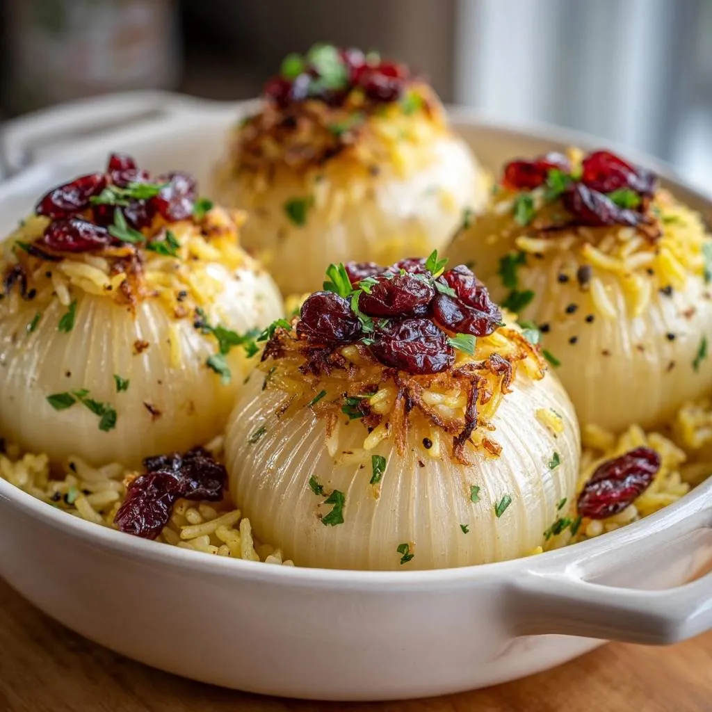 - Cover with foil and bake 20 minutes. Uncover and bake another 10-15 minutes until tops are golden and crispy. Garnish with extra parsley and cranberries. Serve hot for tender onions and juicy, flavorful filling every time!
