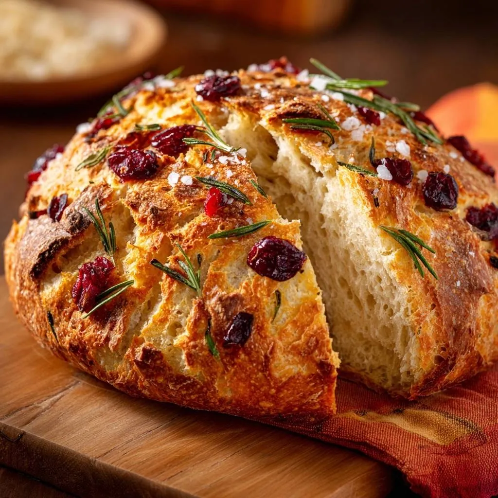 Dried cranberries bring tart chew that bursts against the soft crumb. Fresh rosemary delivers a piney aroma that infuses deeply, unlike dried which lacks punch. Coarse sea salt on top adds crunch and seasons each slice perfectly.
