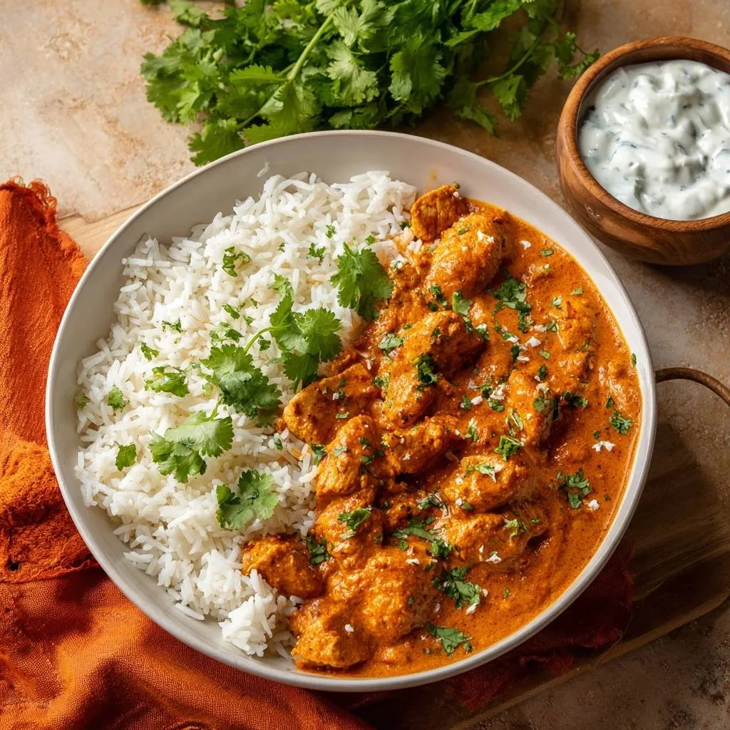 - Serve over warm basmati rice with raita on the side. Garnish with cilantro. Enjoy tender chicken in every creamy bite!