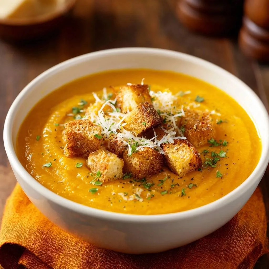 Ladle hot soup into bowls. Top with croutons and grated Parmesan. The crunch contrasts the creaminess perfectly.