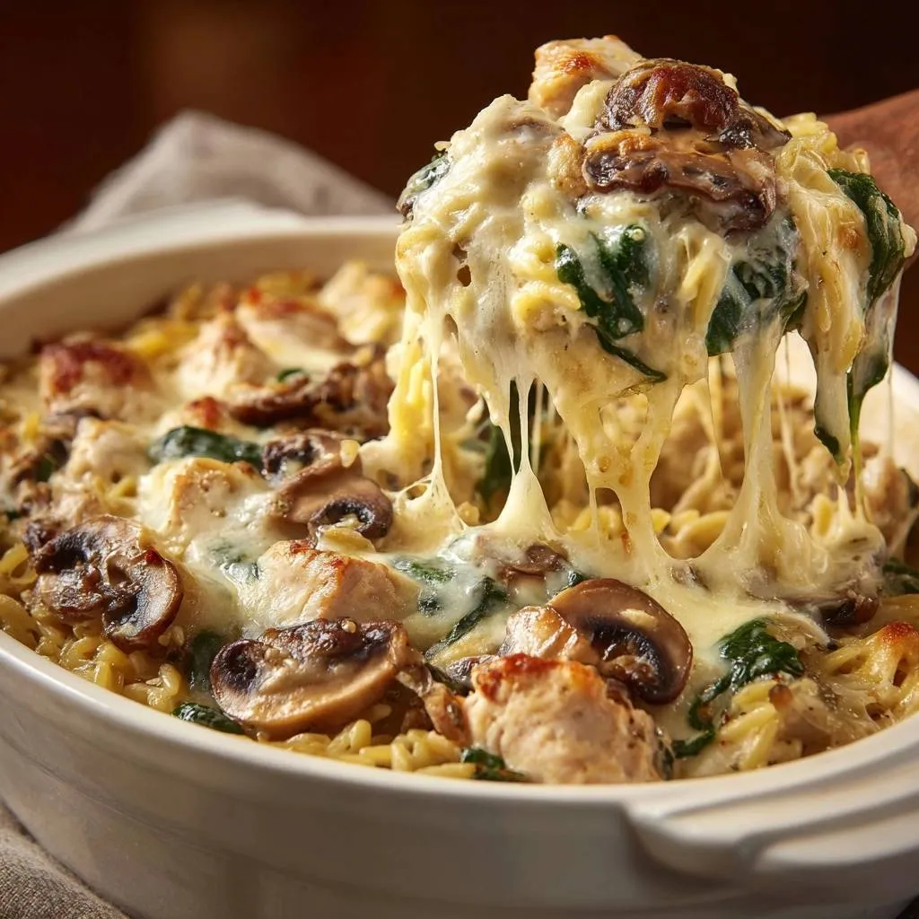 Creamy Chicken Mushroom Spinach Orzo Bake