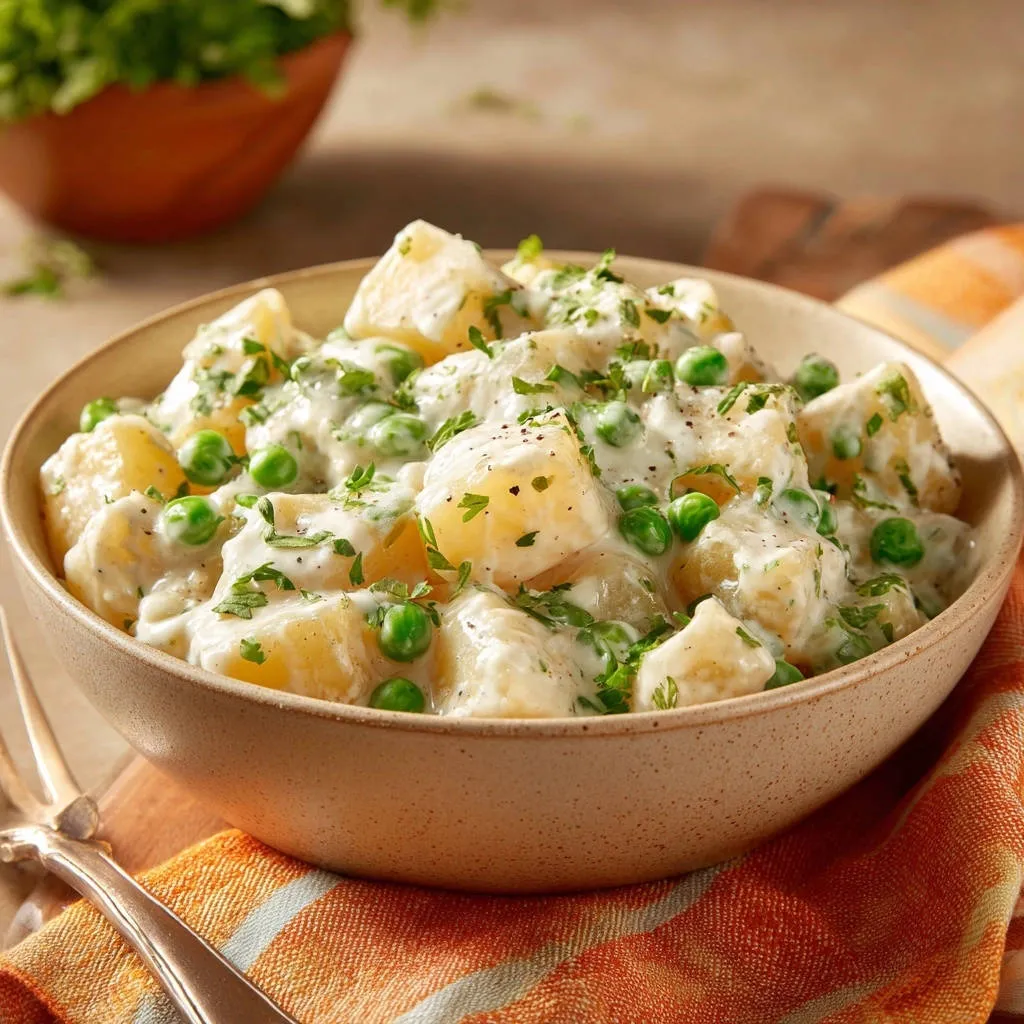 - Gently fold all the ingredients together with a spatula until the potatoes and peas are evenly coated with the creamy dressing. Avoid overmixing, which can break down the potatoes.