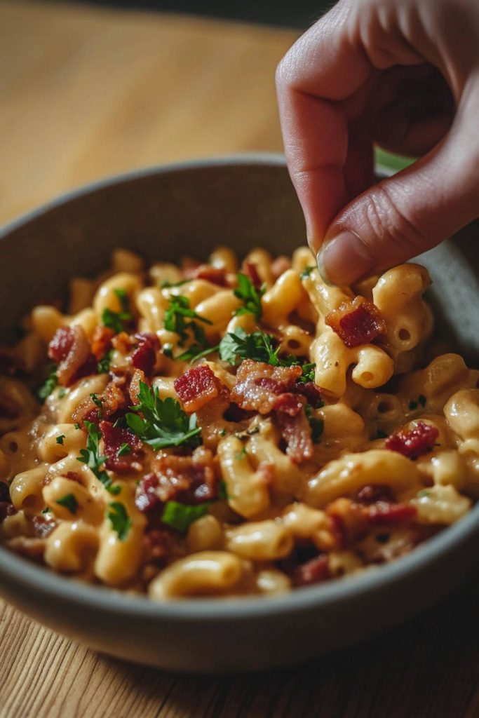 Serve your Creamy Dream Mac & Cheese hot and fresh, topped with the irresistible candied beef bacon and a sprinkle of fresh parsley for a vibrant finishing touch.