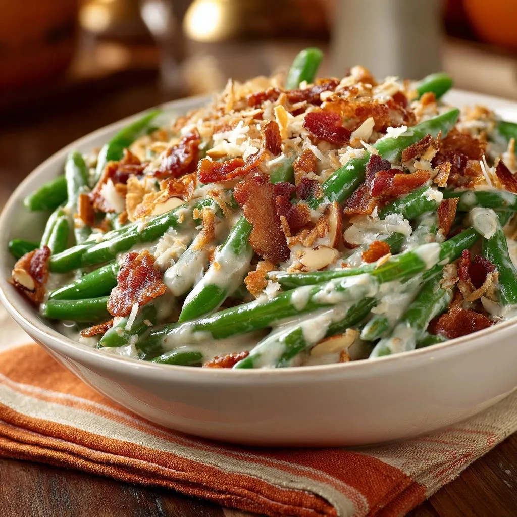 Transfer the creamy green beans to your chosen serving dish. Generously sprinkle the crumbled bacon, toasted sliced almonds, and the crispy breadcrumb mixture over the top. Serve warm and savor your perfectly textured and flavorful Creamy Green Beans with Crispy Topping!