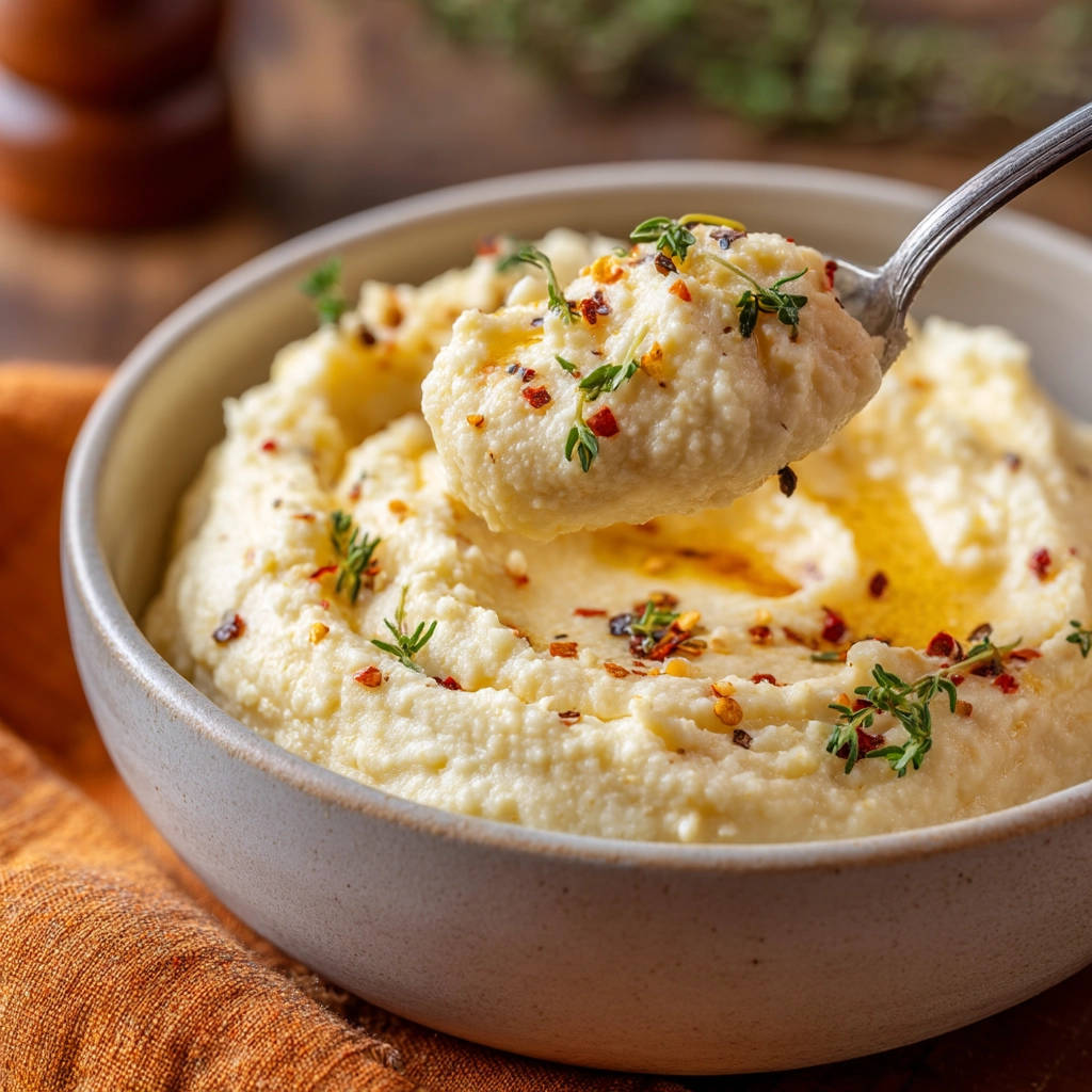 - Transfer the mashed cauliflower to a serving bowl. Drizzle with a little melted butter if desired and garnish with fresh thyme leaves and red pepper flakes before serving hot.