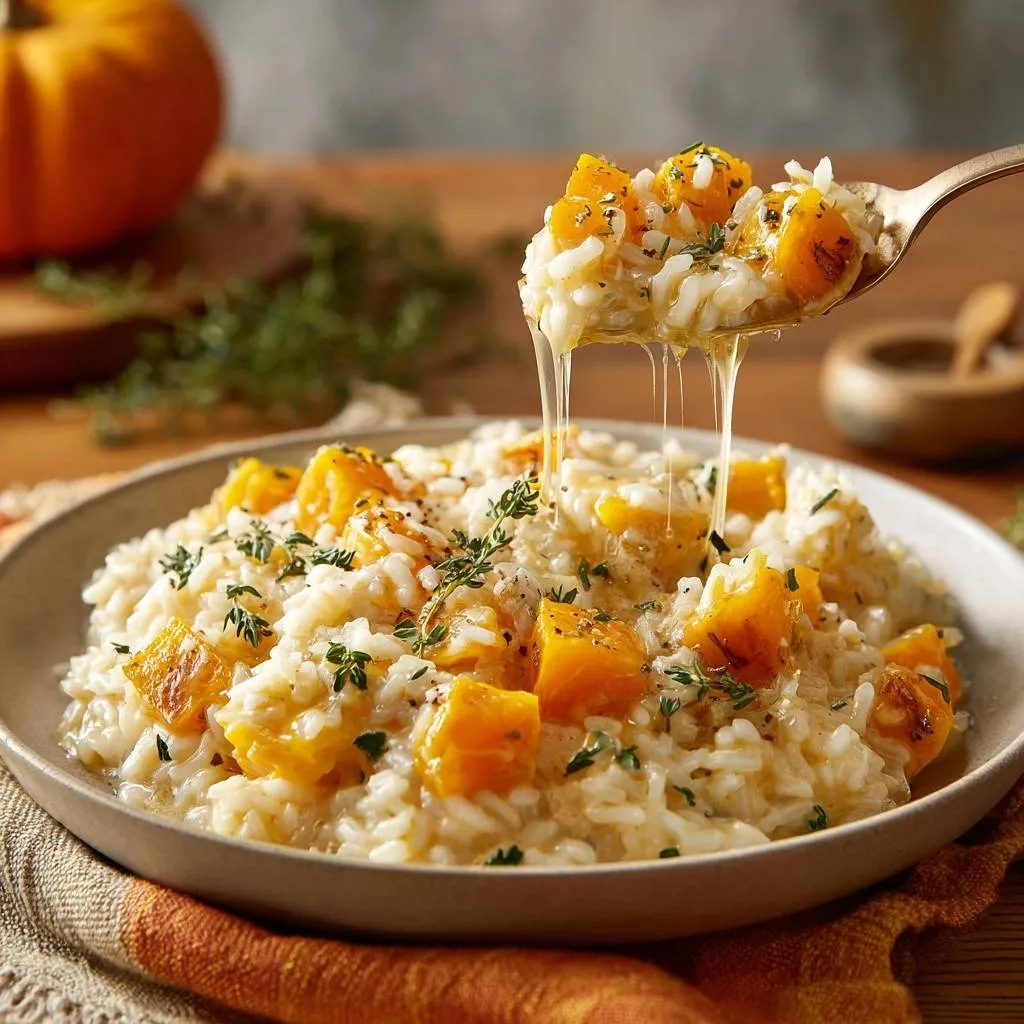 Cool quickly, then store in an airtight container in the fridge for up to 3 days. It doesn’t freeze well because the emulsion breaks; rice gets grainy and squash mushy. Reheat gently with a splash of hot broth over low heat, stirring until creamy again.