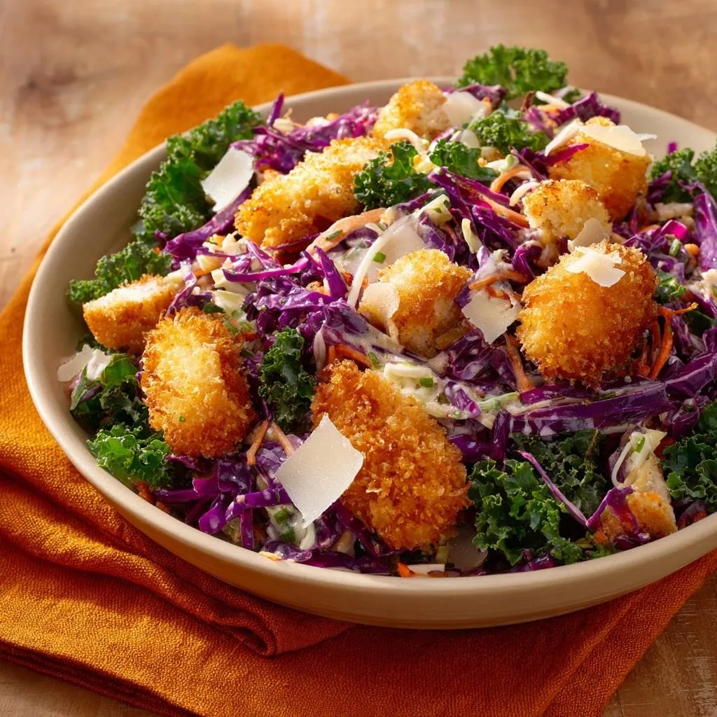 - Assemble salad immediately: Pile cabbage-kale mix into bowls. Top with hot crispy chicken pieces and shave fresh Parmesan over top. Serve right away, tossing tableside only if desired, to guarantee crunch in every forkful. Enjoy your fail-proof crispy salad!