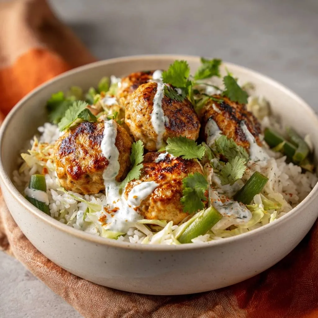 Spoon warm rice into bowls as base. Nestle meatballs on top, drizzle yogurt sauce in rivers. Scatter cilantro leaves and chili slices for color pop.