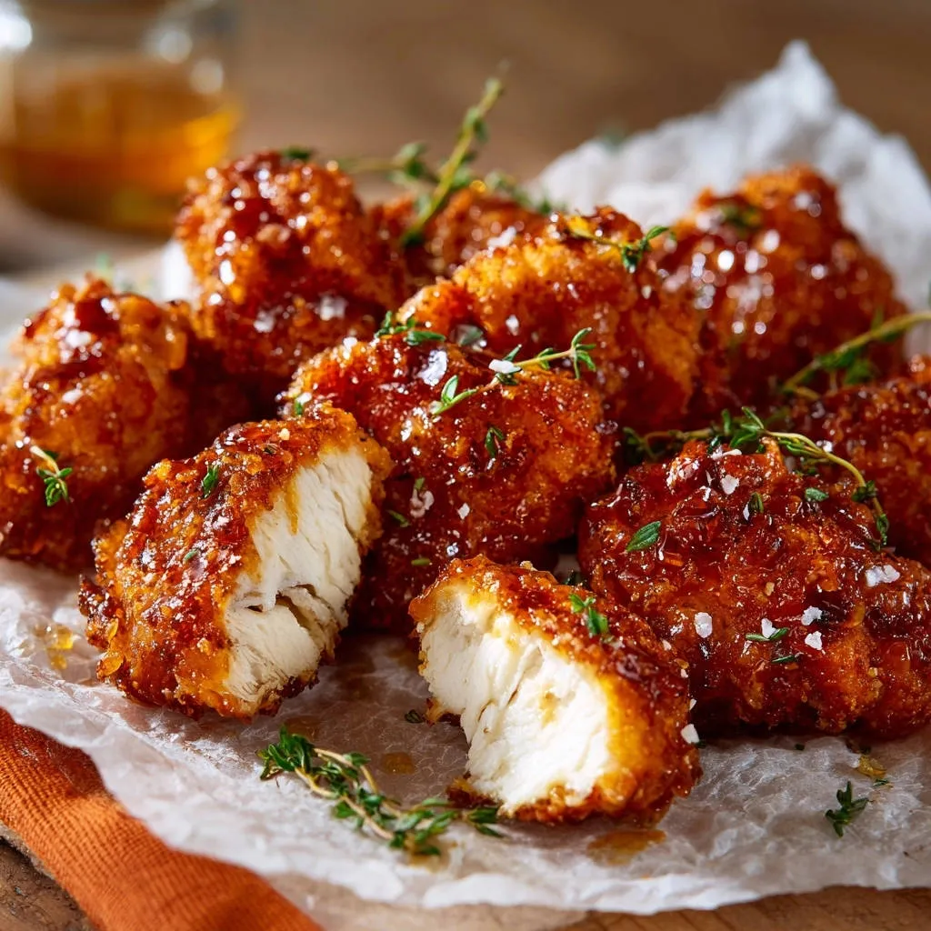 - Coat and Garnish: Once all chicken is fried, gently toss the warm crispy chicken cutlets in the prepared glaze until evenly coated. Transfer to a serving platter and garnish generously with fresh thyme sprigs. Serve immediately and enjoy that perfectly juicy, crispy goodness!