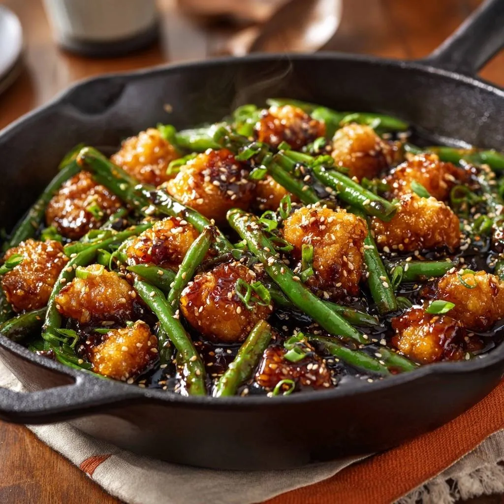 Picture this: that first bite of crispy sesame chicken with green beans where the exterior shatters into golden shards, revealing juicy chicken inside, all while glossy sauce clings to the edges without turning anything soggy. You’ve battled mushy takeout versions that lose their crunch in seconds. This recipe fixes that forever with a double-cornstarch coat that repels sauce like armor.