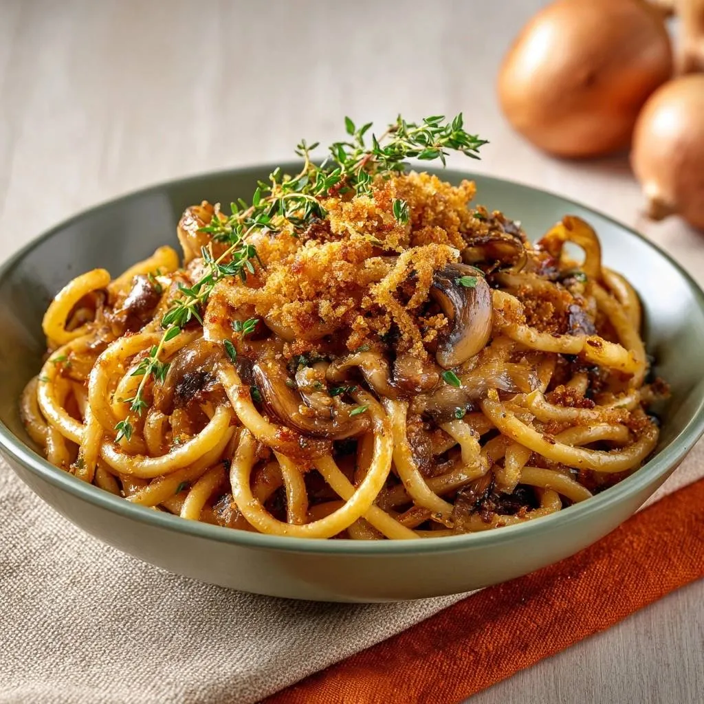 Bucatini’s thick shape traps sauce perfectly, but spaghetti works too. Fresh thyme leaves release volatile oils for bright aroma, way punchier than dried. Panko breadcrumbs give superior crunch thanks to their coarse, airy texture.