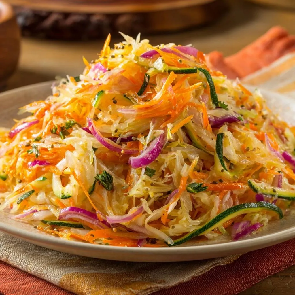 Green cabbage’s thick cell walls resist wilting better than softer types. Grate carrots finely so they mingle without dominating. Together, they create perfect texture contrast with the zoodles.