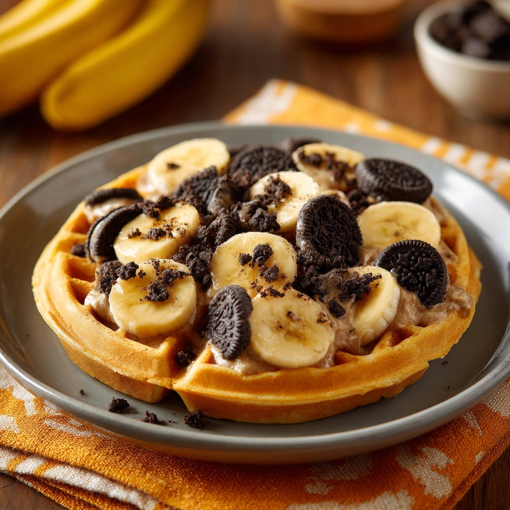 Prep Your Toppings (While Waffles Cook): While your waffles are cooking, prepare your decadent toppings. Slice the ripe bananas into rounds or halves, whichever you prefer. Take your chocolate sandwich cookies and give them a good crush. You can do this by placing them in a zip-top bag and crushing them with a rolling pin or the bottom of a glass, or just crumble them coarsely with your hands. Having these ready means you can top the waffle as soon as it’s done.