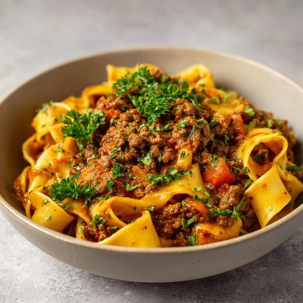 Serve & Garnish: Your Quick & Rich Meat Sauce Pasta is ready! Serve it immediately in warm bowls. Garnish each serving generously with fresh chopped parsley for a bright finish.