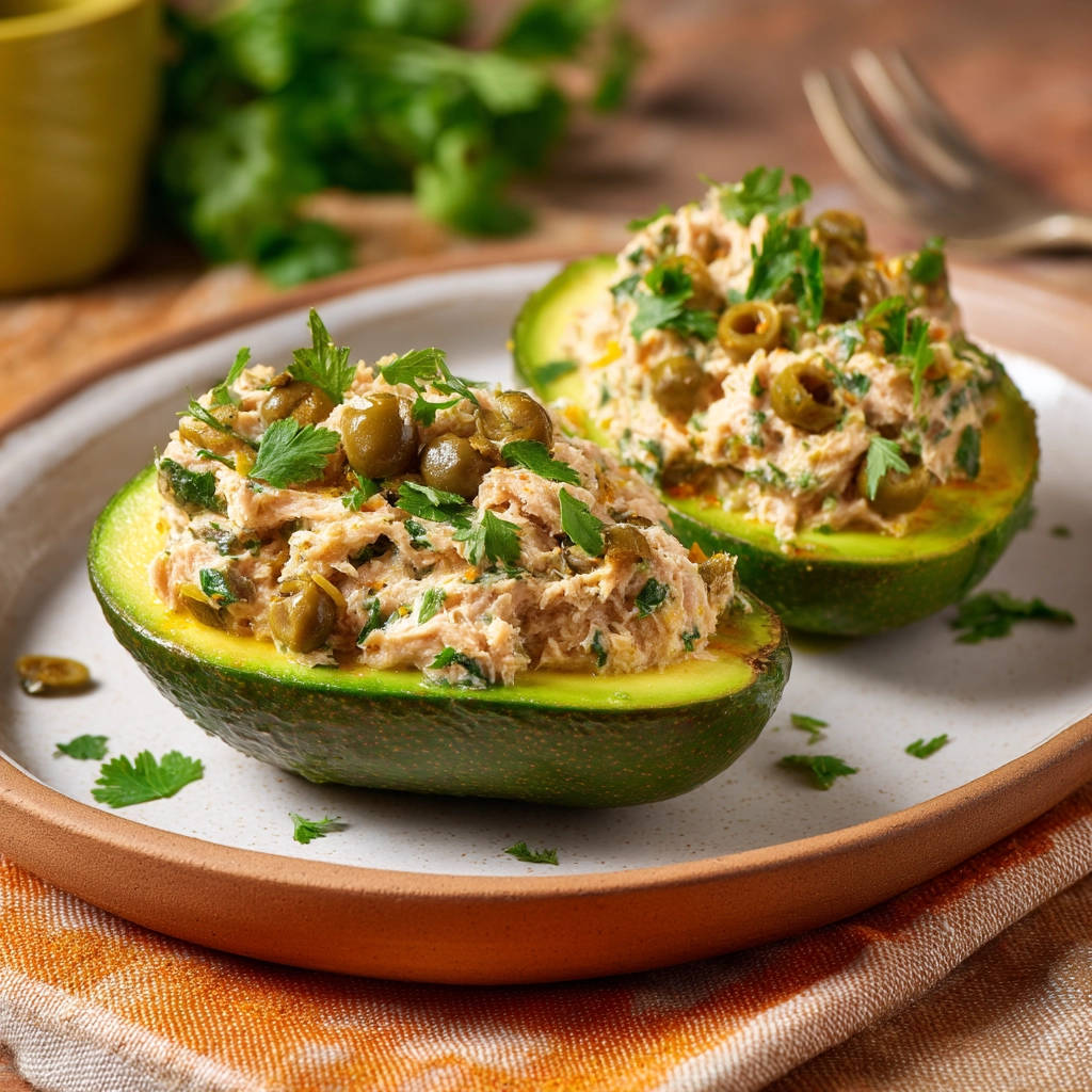 - Finally, add the finishing touches. Garnish each Tuna Stuffed Avocado half with a sprinkle of extra capers and a few fresh parsley leaves. This adds both visual appeal and an extra burst of fresh flavor. Serve immediately to enjoy the contrast of the cool, creamy avocado and the flavorful tuna salad.