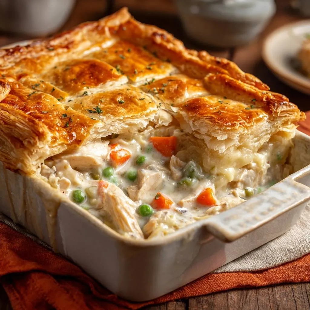 Puff pastry’s magic comes from hundreds of thin butter layers that expand with steam at high heat. At 425°F, water in the butter turns to vapor, puffing the dough sky-high into golden flakes. This flaky chicken pot pie leverages that fully.