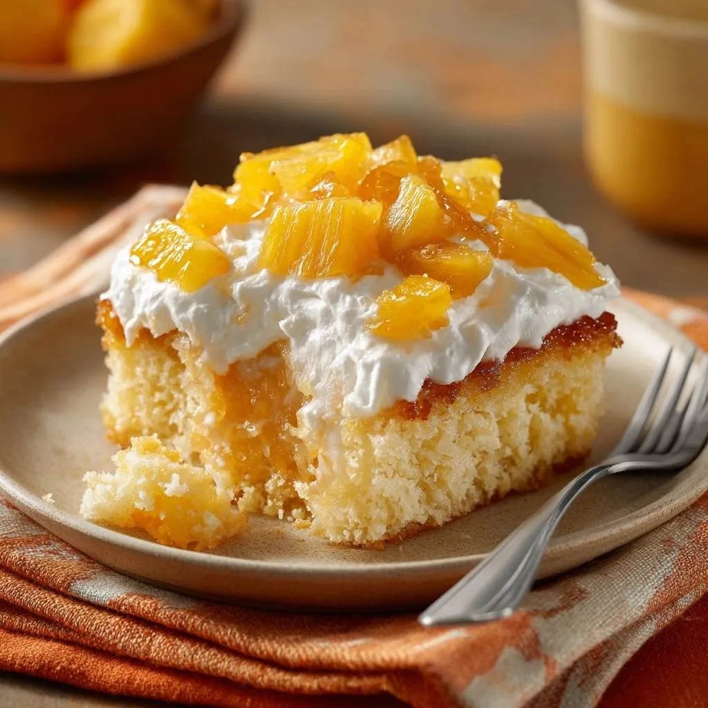 Spread evenly. Bake 30-35 minutes till golden, springs back, cracks form. Cool on rack 1 hour; it settles but stays fluffy. Top with whipped cream, sugared pineapple; chill for best texture.