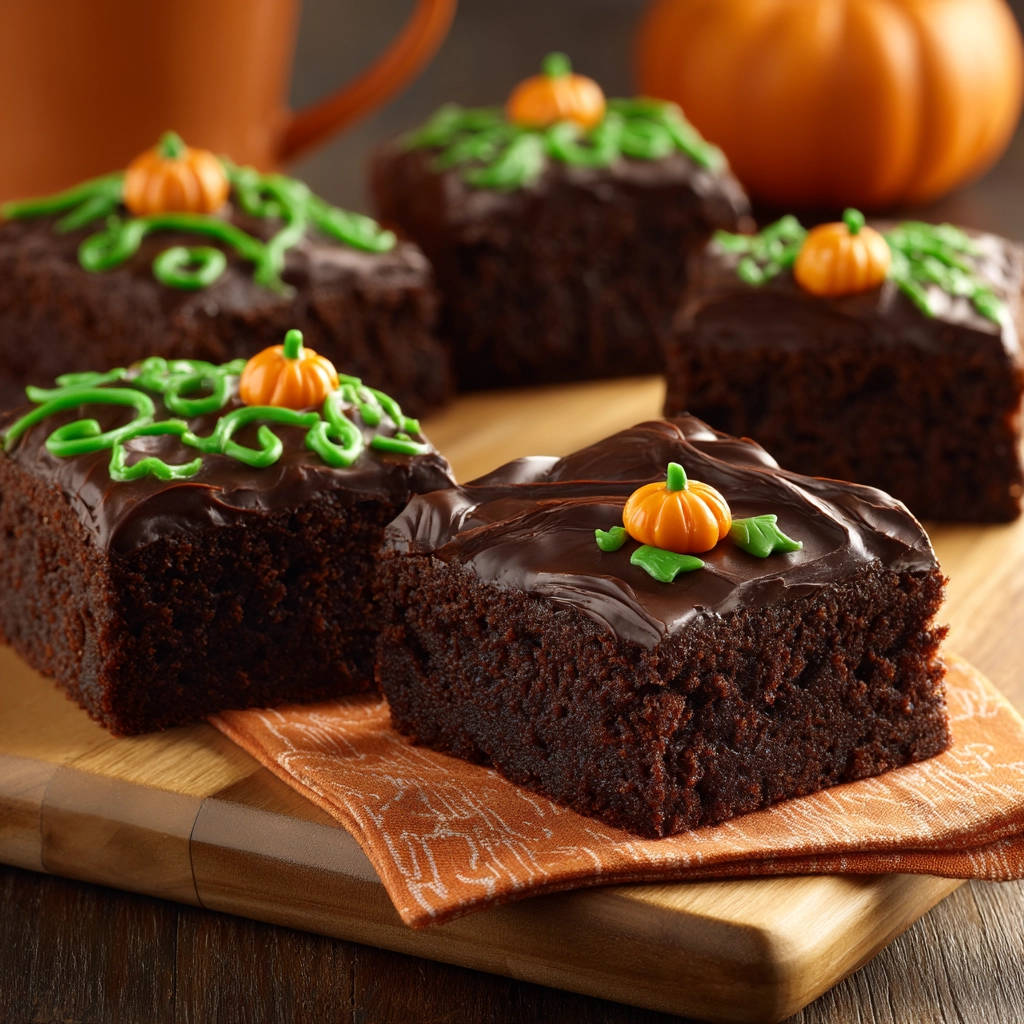 - Cut the brownies into squares. Decorate each square with green icing swirls, orange candy dots, and a candy pumpkin to create a festive look.