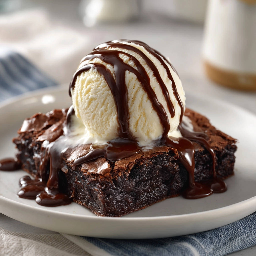 - To serve, place a warm (or room temperature) brownie on a plate, top with a scoop of vanilla ice cream, drizzle generously with warm chocolate sauce, and sprinkle with chocolate sprinkles or crushed cookies. Enjoy that perfectly fudgy bite!