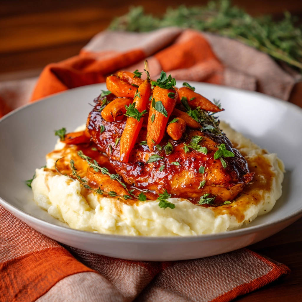- Serve Your Delicious Dinner: Once the chicken is cooked through, remove the thyme sprigs from the sauce. It’s time to plate! Spoon a generous portion of the warm mashed potatoes onto each plate. Place a glazed chicken breast over the potatoes. Spoon plenty of that glorious, thickened sauce over both the chicken and the mashed potatoes. Top with your roasted carrots and garnish everything with fresh chopped parsley for brightness. Serve immediately and enjoy your perfectly juicy glazed chicken dinner!