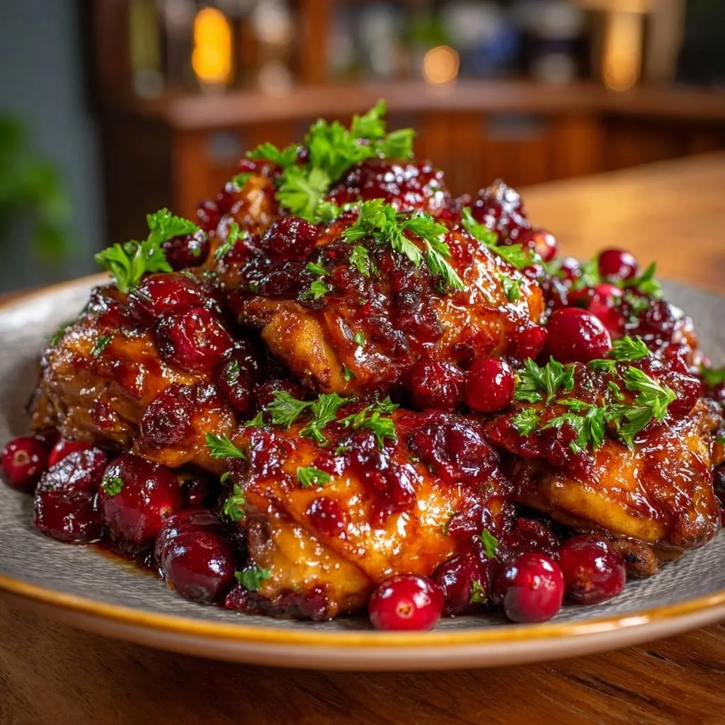 Before you serve, let the chicken rest for at least five minutes. This allows the muscle fibers to relax and reabsorb the juices. If you cut into it immediately, all that moisture will run out onto the plate, leaving the meat dry. Garnish heavily with fresh chopped curly parsley right before the skillet hits the table. The bright green contrast against the deep red cranberries makes the colors pop and adds a necessary hit of freshness to the rich dish.