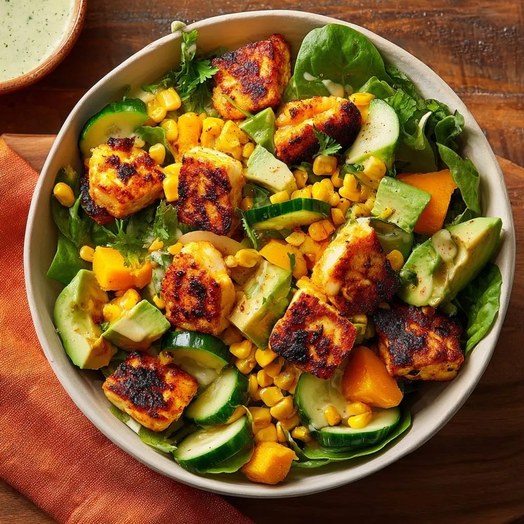 - In a large bowl, toss lettuce, cucumber, avocado, cilantro, roasted squash, charred corn, and crispy paneer. Drizzle with yogurt dressing and serve immediately for peak crunch.