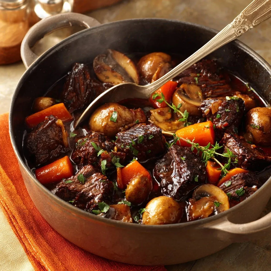 Yes, you can adapt this recipe for a slow cooker! You’ll still want to sear the beef and sauté the onions and garlic in a pan on the stovetop for maximum flavor before adding them to the slow cooker insert. Then add the broth, carrots, mushrooms, and herbs. Cook on low for 6-8 hours or on high for 3-4 hours, until the beef is tender. The sauce might be thinner in a slow cooker, so you might need to thicken it at the end using a cornstarch slurry.