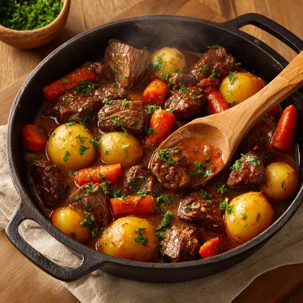 Fresh chopped parsley, 1/4 cup, adds bright garnish at the end. For substitutions, try vegetable broth for a lighter version. Whole small potatoes beat chopped ones for stew integrity every time.