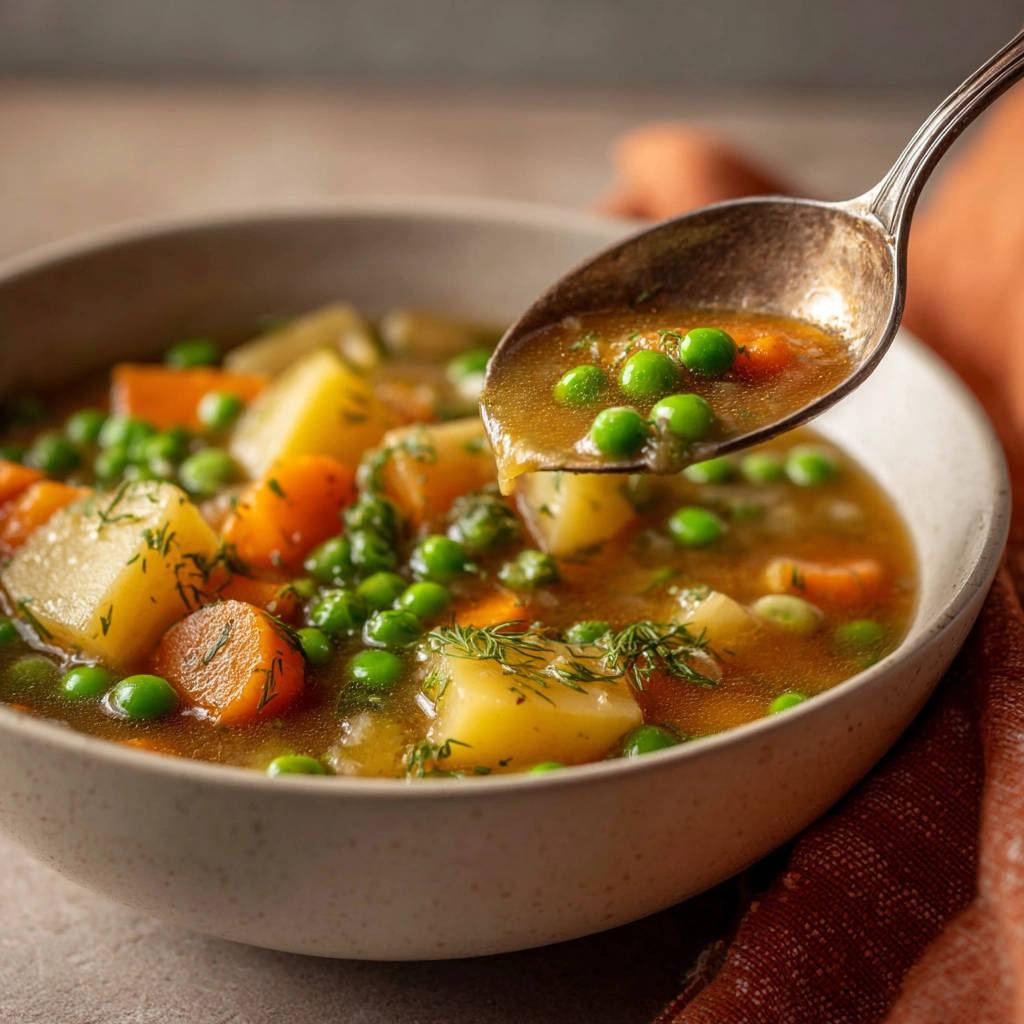 This soup is designed to be a brothy, light yet hearty soup. If you prefer a thicker soup, you have a few options. You can blend a portion of the soup (about 1-2 cups) using an immersion blender or carefully transferring some to a regular blender, then stirring it back in. The cooked potatoes will help thicken it. Alternatively, you can make a slurry of 1-2 tablespoons of cornstarch or flour mixed with an equal amount of cold water, and whisk it into the simmering soup after the peas have cooked, letting it simmer for a few more minutes until thickened. Just remember blending some of the soup keeps it entirely vegetable-based and often provides a lovely creamy texture without added thickeners.