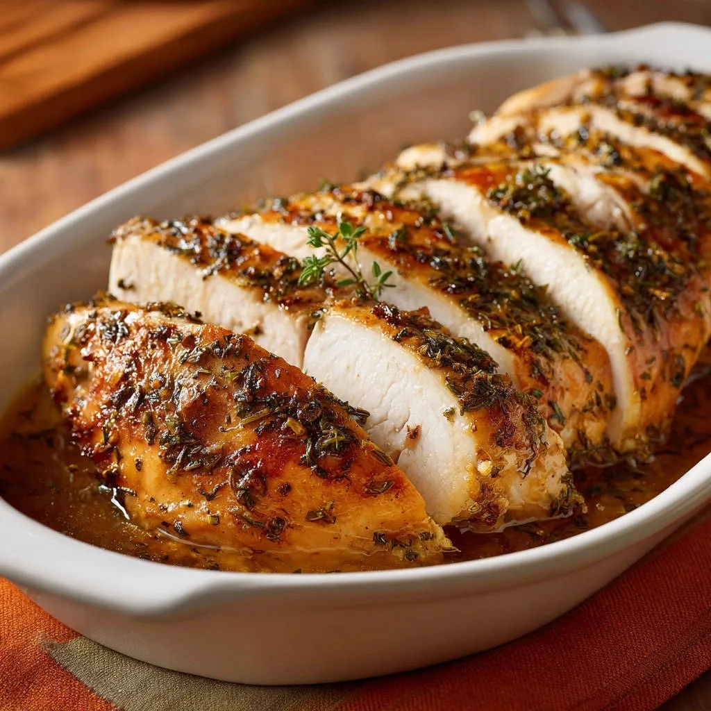 - After resting, slice the chicken breasts against the grain into thick pieces. Arrange them in a serving dish, pouring the pan juices from the skillet over the top. Garnish with a fresh thyme sprig if desired. Serve immediately and enjoy your perfectly juicy chicken!