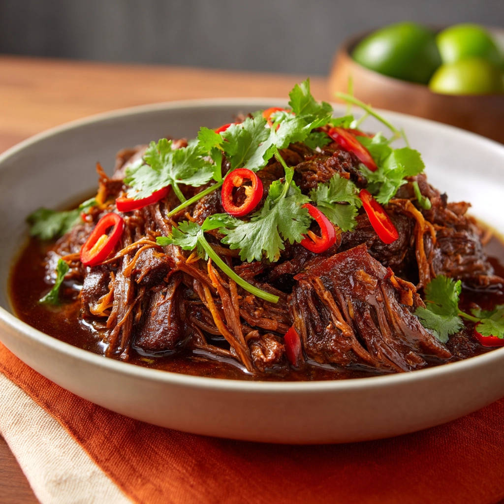 - Serve the shredded beef hot with the sauce. Garnish generously with sliced red chilies green onions and fresh cilantro leaves.