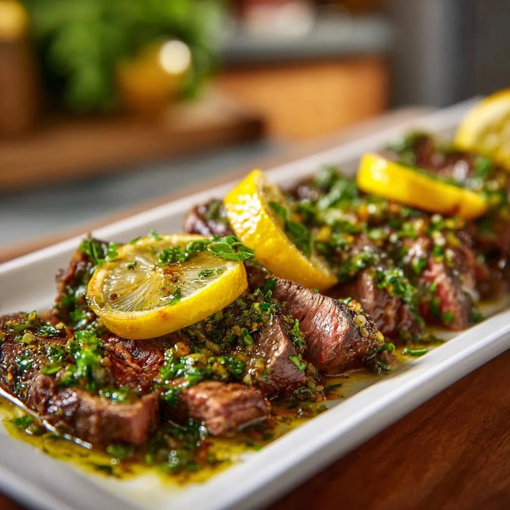 Arrange the beautifully sliced steak on a serving platter. Generously spoon the prepared chimichurri sauce over the sliced beef, allowing its vibrant colors and aromas to infuse the dish. Drizzle with fresh lemon juice from one lemon for an extra layer of brightness, then garnish with lemon wedges. Serve your Juicy Steak with Bright Chimichurri immediately and savor every bite.
