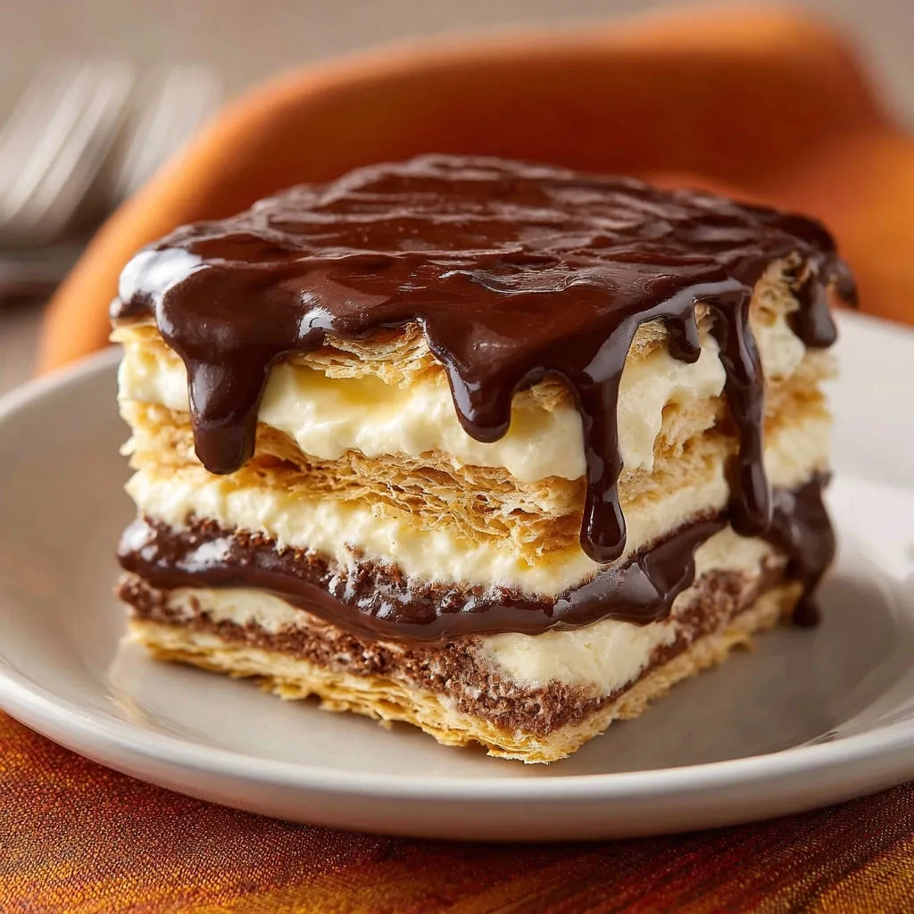 Refrigerate the assembled Layered Chocolate Vanilla Cream Square for at least one hour to allow the glaze to set firmly. Since the squares are already perfectly pre-cut, simply slice through the top glaze layer for effortless, clean presentation.