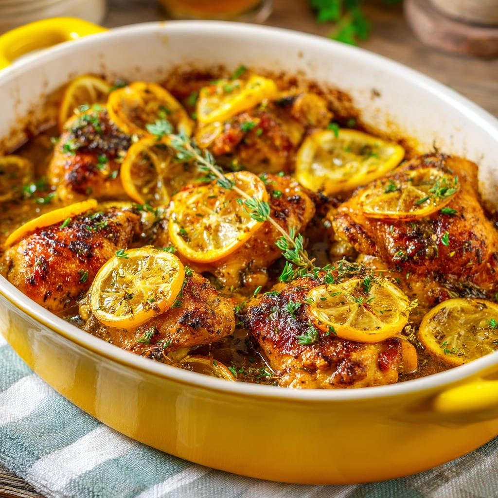 Add the Lemon Slices and Herbs: Take one of your lemons and slice it into rounds. Tuck these lemon slices around and even directly on top of the chicken pieces in the baking dish. The lemon slices will release their aromatic oils and juice as they roast, contributing significantly to the pan sauce. Scatter the reserved whole rosemary and thyme sprigs into the pan around the chicken. They’ll release their fragrance, too!