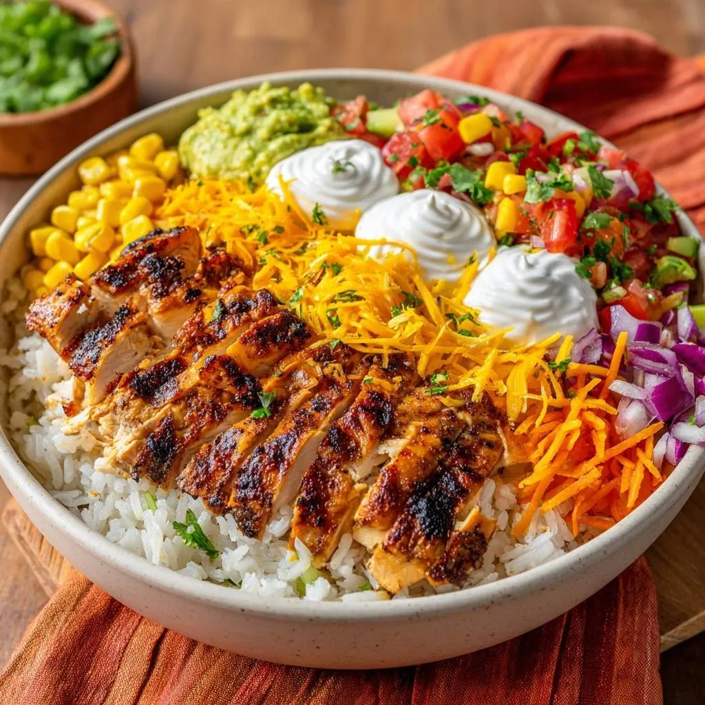 - Assemble bowls: Divide rice among 4 bowls. Top with chicken, corn, cheese, guacamole, sour cream dollops, pico de gallo (mix tomatoes, onion, cilantro), cabbage, carrots, and lettuce. Garnish with cilantro.
