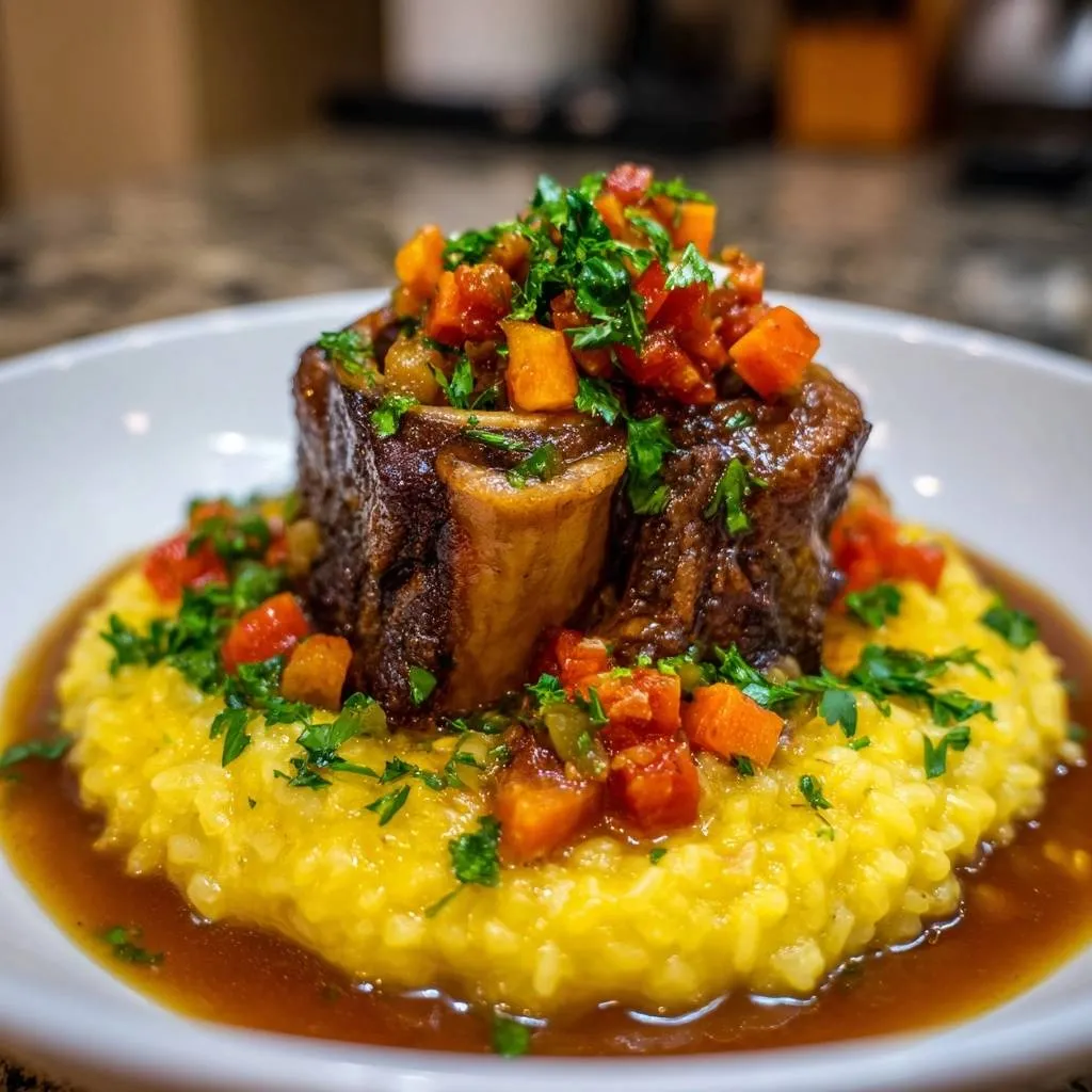 Presentation is key for a dish this special. Start with a wide, shallow bowl and spoon in a generous portion of the golden risotto. Give the bottom of the bowl a gentle tap on the counter to help the rice spread out evenly. Place one short rib right in the center, standing it tall.