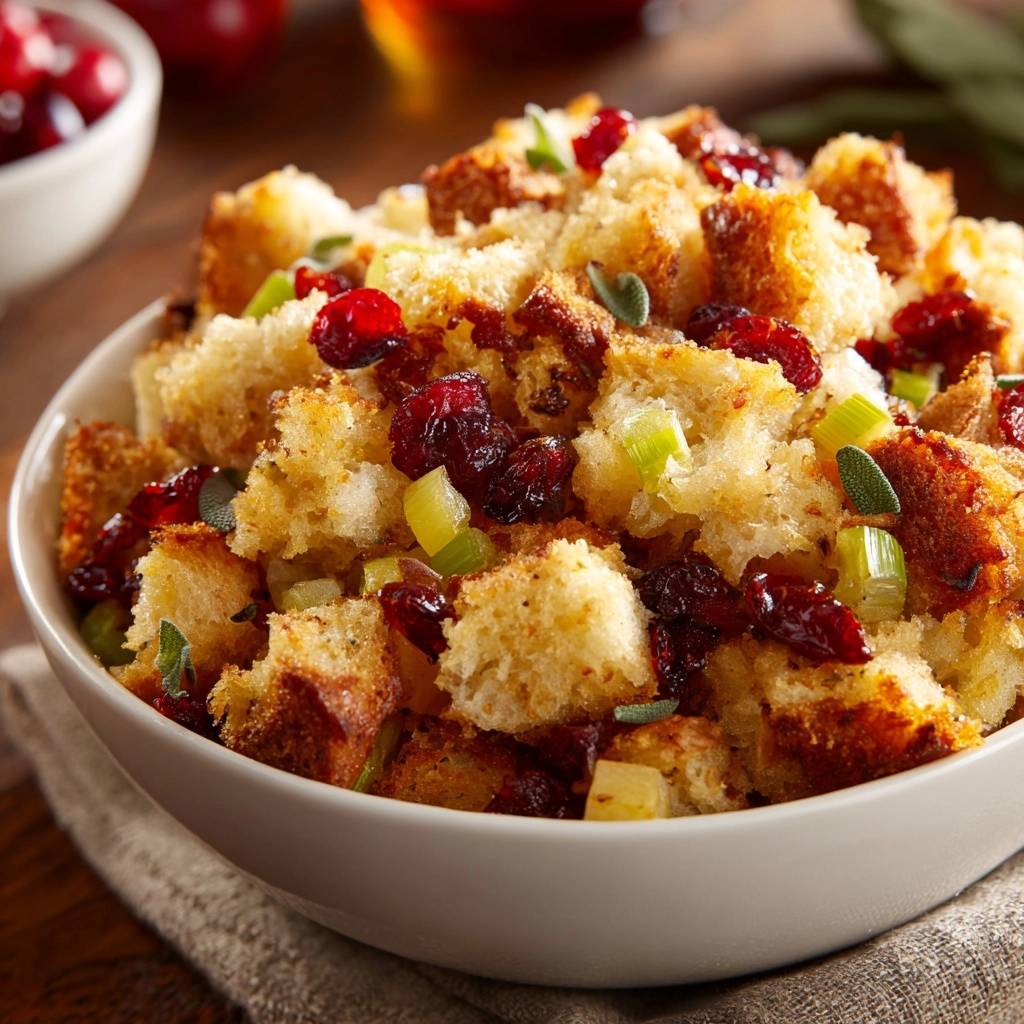 Stuffing is the ultimate make-ahead dish if you handle the steps correctly. You can toast the sourdough cubes up to 3 days in advance; just keep them in a sealed bag or container at room temperature. The vegetable and cranberry base can be sautéed 24 hours ahead and stored in the fridge.