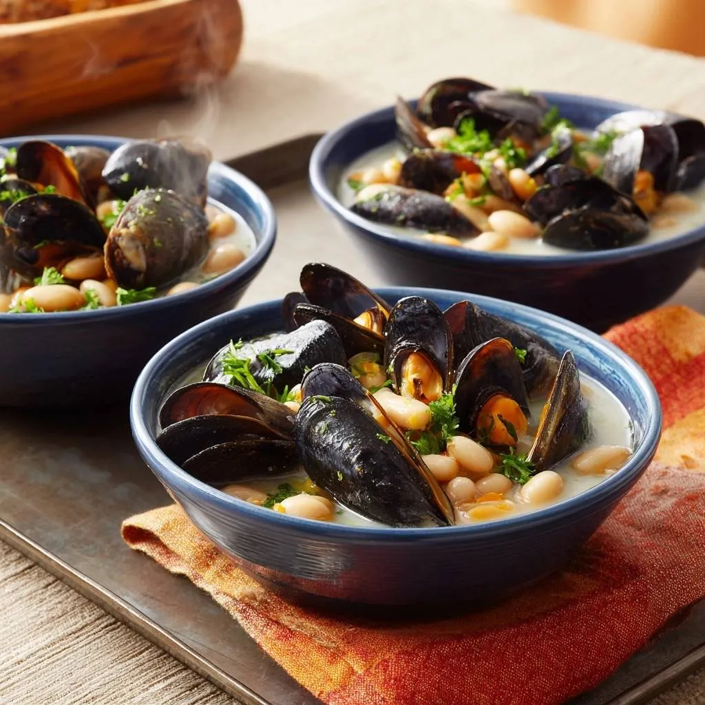 To balance the richness of the butter and cream, serve a light, acidic side salad. A simple toss of wild arugula with lemon juice, olive oil, and a shaving of parmesan provides a peppery bite that cleanses the palate between spoonfuls of the decadent mussels and beans.
