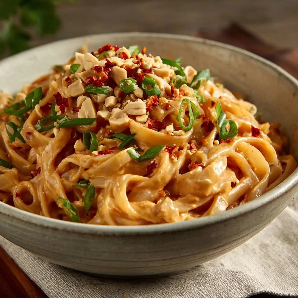 While you can technically use any rice noodle, wide ribbons (often labeled as “XL” or “Pad See Ew” style) are the gold standard here. The broader surface area allows the heavy peanut sauce to coat the noodle evenly without weighing it down.
