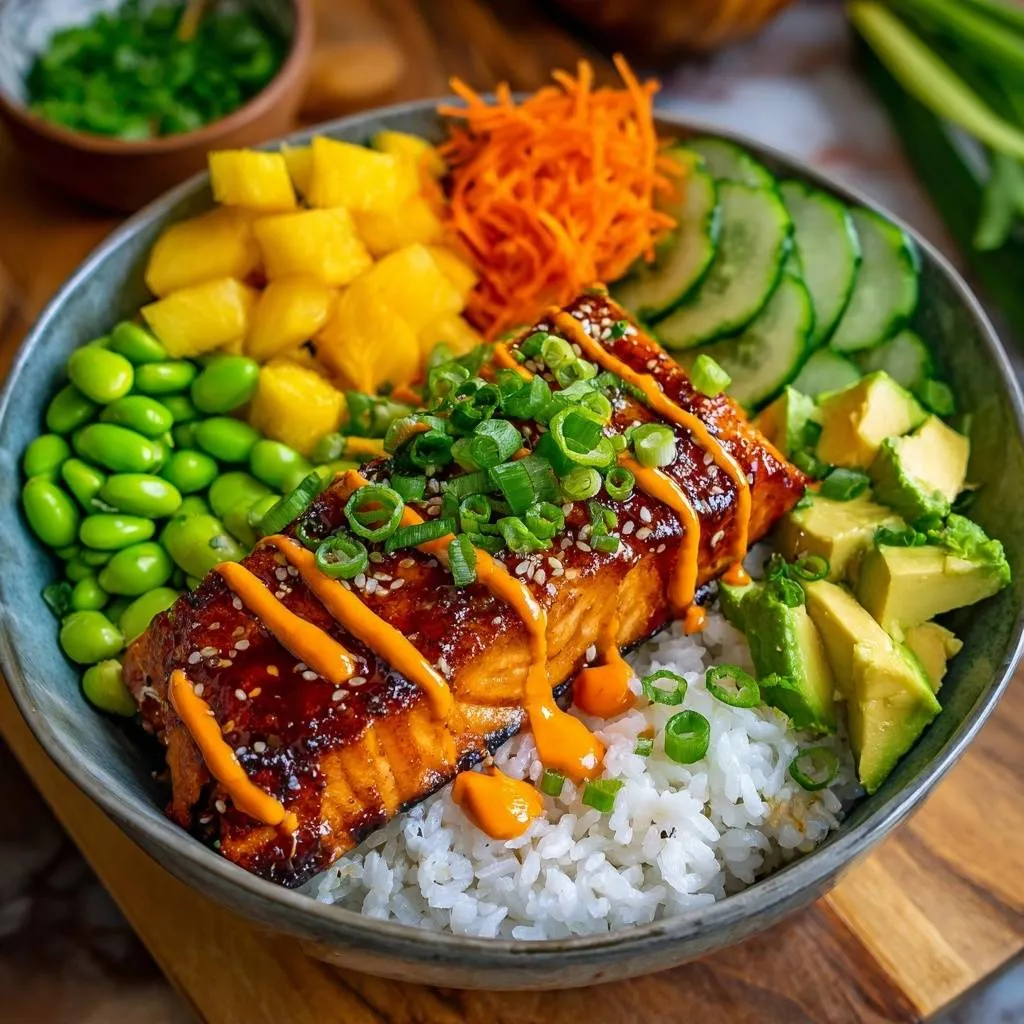 Place the glazed salmon fillet directly in the center. Now, work your way around the fish, placing the mango, edamame, cucumber, carrots, and avocado in their own distinct sections. This “deconstructed” look is what defines high-end poke shops. Finally, garnish with the green onions and sesame seeds, and apply the spicy mayo in a tight, fast zigzag pattern for that final professional touch.
