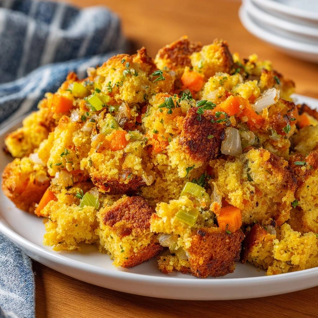 Golden Cornbread and Herb Stuffing is the ultimate solution to the “mushy stuffing” epidemic. Cornbread offers a sturdy, porous structural base that stands up to broth much better than standard white bread. It provides a beautiful balance of savory herbs and a hint of sweetness that complements any festive spread.
