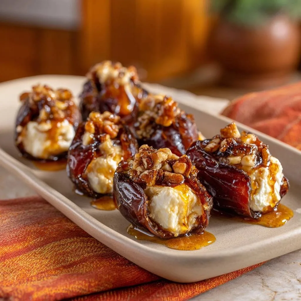 Presentation is half the battle with finger foods. To make the glossy, honey-drenched dates really pop, serve them on a dark surface like a slate board or a deep blue ceramic platter. The contrast between the dark fruit and the light cheese creates a striking visual that draws people in immediately.