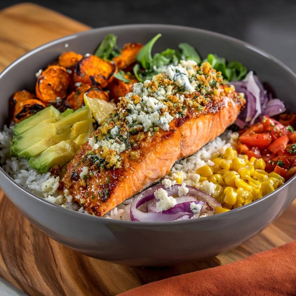 Assembly is an art form that preserves the work you put into the salmon. Use a “perimeter arrangement” strategy by placing the rice and greens in the center, then tucking the sweet potatoes, corn, and onions around the edges. Keep the “wet” ingredients, like the sliced avocado and juicy tomatoes, away from the salmon until you are ready to eat. This prevents the moisture from the vegetables from migrating into your crispy panko crust.