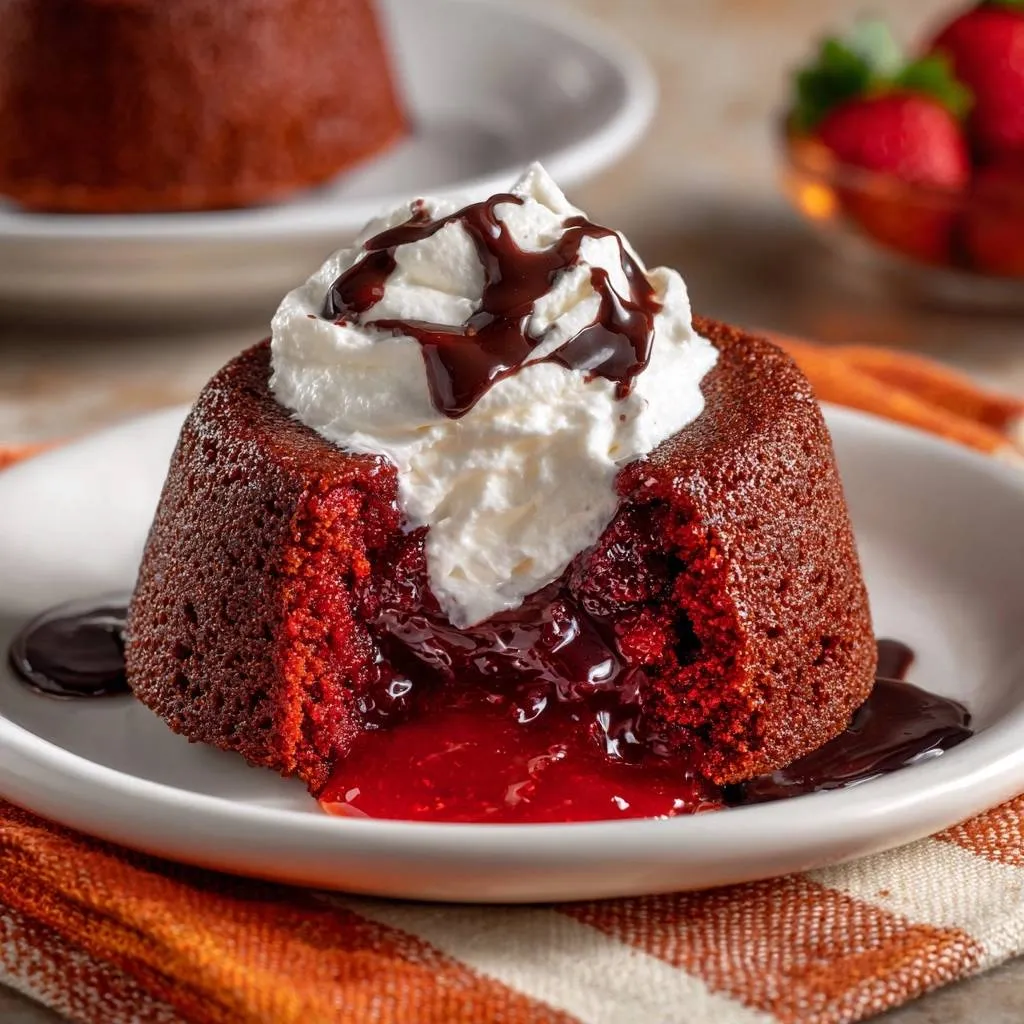 Red velvet is visually striking, but it needs contrast to really pop. A snowy white dollop of whipped cream provides a beautiful color break against the red cake. I love adding a drizzle of chocolate syrup around the base of the cake to add depth. If you want to go the extra mile, a few fresh raspberries or a sprig of mint adds a fresh, acidic element that cuts through the richness of the white chocolate center.