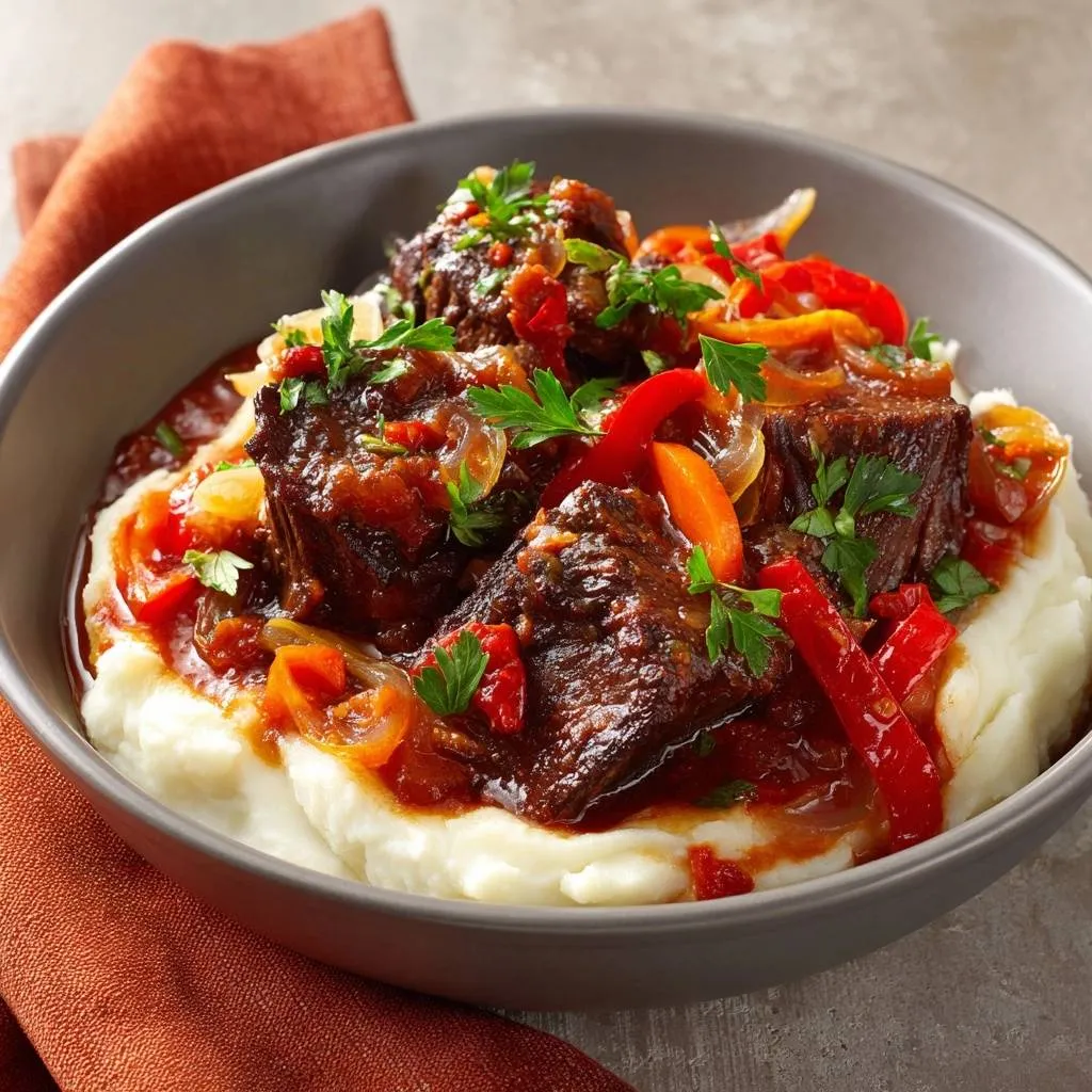 - To serve, create a wide well in a bowl of creamy mashed potatoes. Ladle the beef, peppers, and carrots into the center. Garnish heavily with fresh chopped parsley to match the visual presentation.
